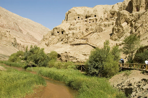 吐峪沟在新疆鄯善县境内的火焰山中段。 东距吐鲁番市约55公里。这里曾经是佛教和伊斯兰教的圣地。